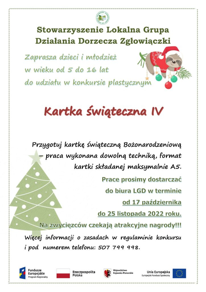Zapraszamy dzieci i młodzież w wieku od 5 do 16 lat z terenu Stowarzyszenia LGD (tj. gminy: Baruchowo, Boniewo, Brześć Kujawski, Choceń, Chodecz, Fabianki, Izbica Kujawska, Kowal, Miasto Kowal, Lubraniec, Lubień Kujawski, Lubanie, Włocławek) do wzięcia udziału w konkursie plastycznym pt. „Kartka świąteczna IV”. Aby wziąć udział w Konkursie należy w terminie od 17 października do 25 listopada 2022 roku dostarczyć do biura Stowarzyszenia na adres: 87- 850 Choceń, ul. Sikorskiego 12, pracę plastyczną- kartkę świąteczną (praca wykonana dowolną techniką, format kartki składanej maksymalnie A5).