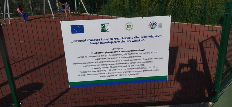 Projekt dofinansowany z Programu Rozwoju Obszarów Wiejskich na lata 2014-2020 na operacje, które odpowiadają warunkom przyznania pomocy w zakresie rozwoju ogólnodostępnej i niekomercyjnej infrastruktury turystycznej lub rekreacyjnej lub kulturalnej działanie 19„Wsparcie dla rozwoju lokalnego w ramach inicjatywy LEADER”/ poddziałanie 19.2 w zakresie Przebudowa placu zabaw w miejscowości Boniewo