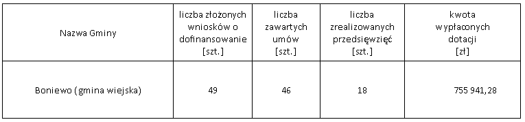Zgodnie z §2 ust. 1 pkt 19 i pkt 20 aneksu do porozumienia w sprawie realizacji Programu Priorytetowego Czyste Powietrze, Gmina Boniewo informuje o statystykach dotyczących realizacji Programu Czyste Powietrze na swoim terenie (stan na dzień 30.09.2023 r.):