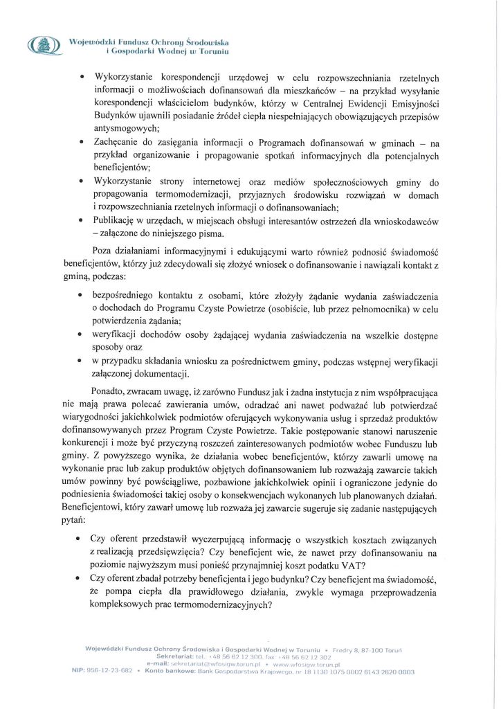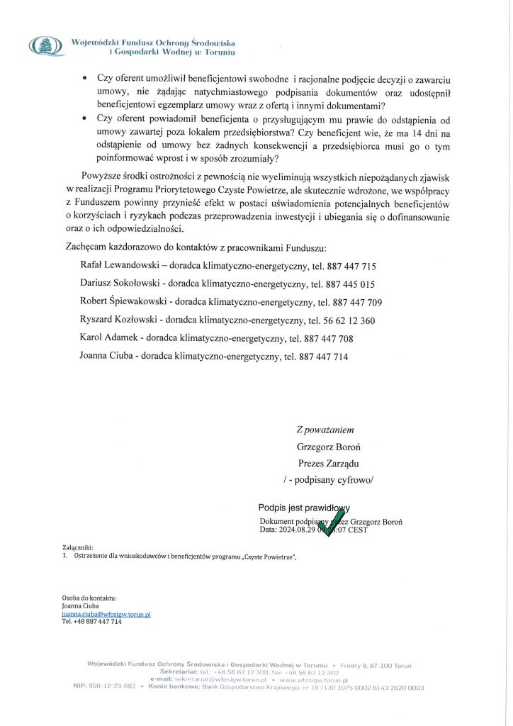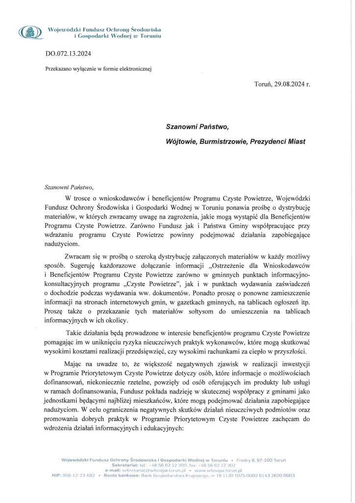 Drodzy mieszkańcy Gminy Boniewo prosimy zapoznać się z pismem Prezesa WFOŚiGW w Toruniu Pana Grzegorza Boronia ws. zwracania uwagi na zagrożenia, jakie mogą wystąpić dla Beneficjentów Programu Czyste Powietrze.