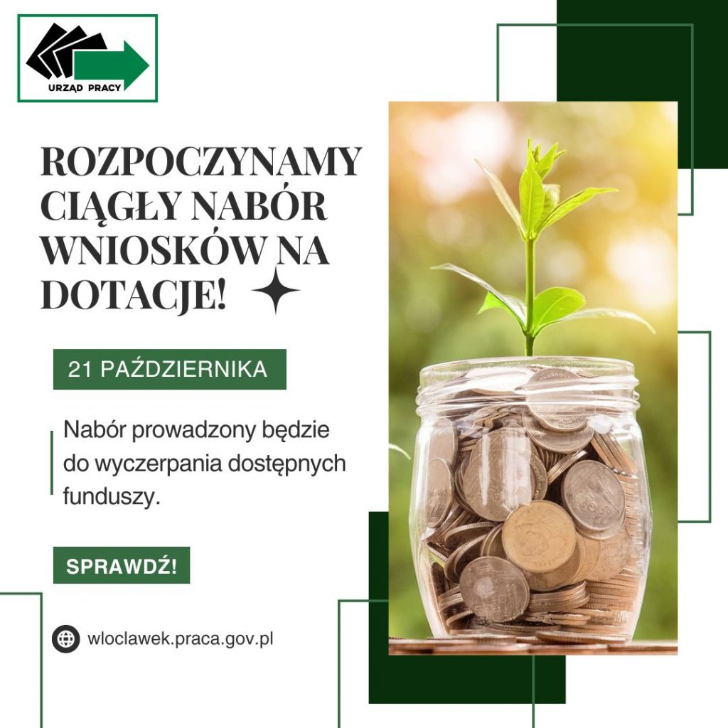 Powiatowy Urząd Pracy we Włocławku informuje, że od najbliższego poniedziałku, tj. 21 października 2024 r. rozpocznie się ciągły nabór wniosków o dotację na: