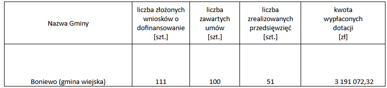Zgodnie z §2 ust. 1 pkt 19 i pkt 20 aneksu do porozumienia w sprawie realizacji Programu Priorytetowego Czyste Powietrze, Gmina Boniewo informuje o statystykach dotyczących realizacji Programu Czyste Powietrze na swoim terenie (stan na dzień 30.06.2025 r.):