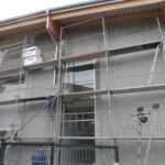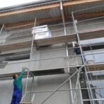Obserwujemy zaawansowanie robót związanych z termomodernizacją budynku szkoły. Ściany budynku szkoły na których zakończono zakładanie ocieplenia są malowane .